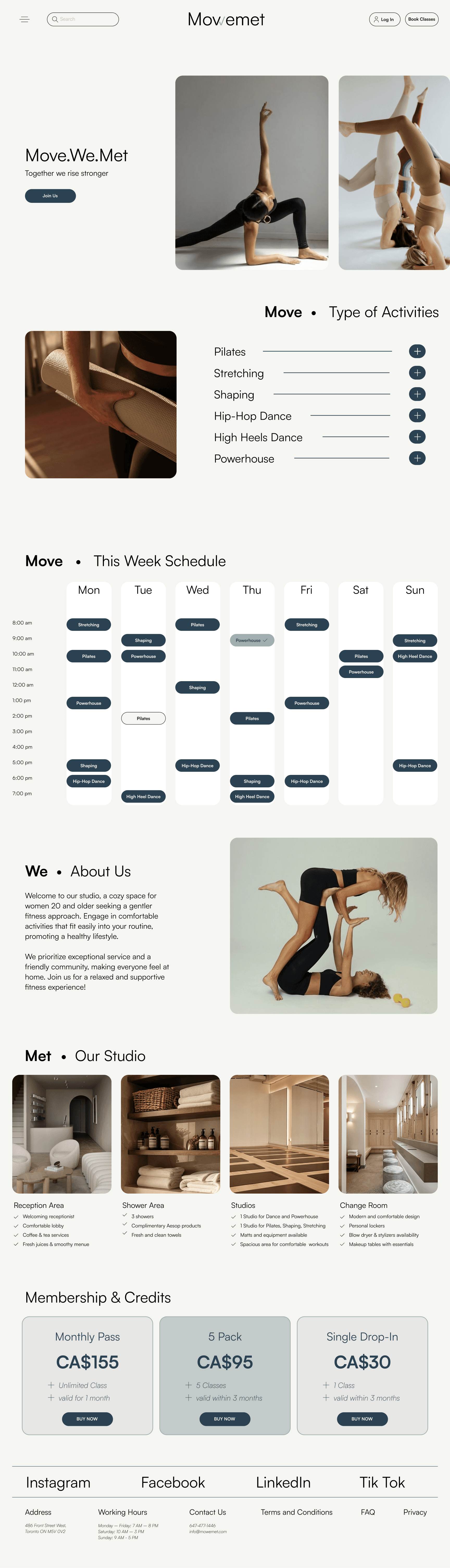 This website concept for a women’s fitness studio centers around the themes of movement and community. Inspired by the word mowemet — combining move, we, and met — the design reflects energy, togetherness, and connection. Dynamic visuals and clean, minimalist layouts highlight the importance of physical activity, comfort, and high-quality service. Soft shapes, light tones, and fresh blue accents create an inviting, modern atmosphere that encourages a healthy and active lifestyle.